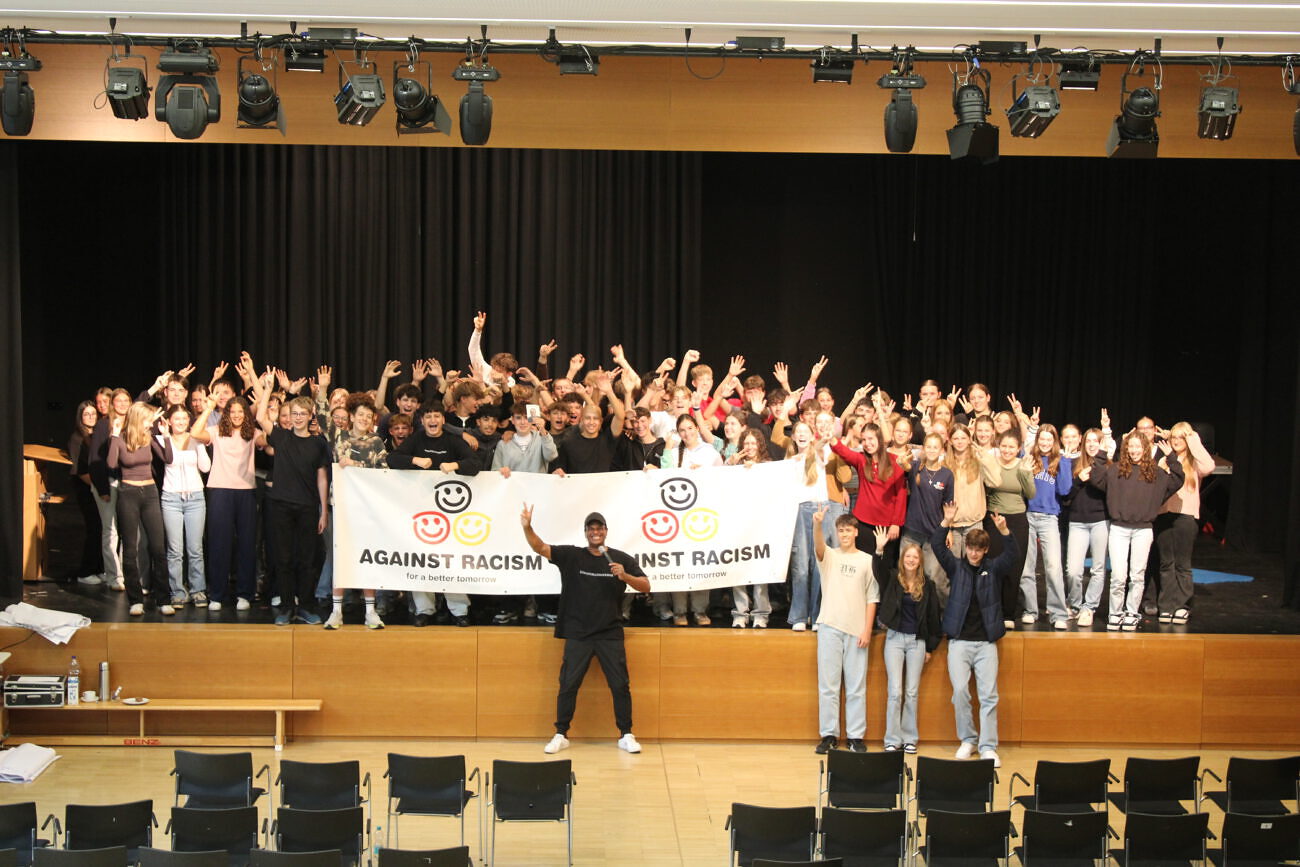 So berichtete er der Jahrgangsstufe 10 am Projekttag „Demokratie (er)leben“ von seinen Erfahrungen als POC (person of colour) in Deutschland, was ihm Kraft gab und wie wir alle für ein gutes Miteinander in der Gesellschaft und der Schule einstehen können.