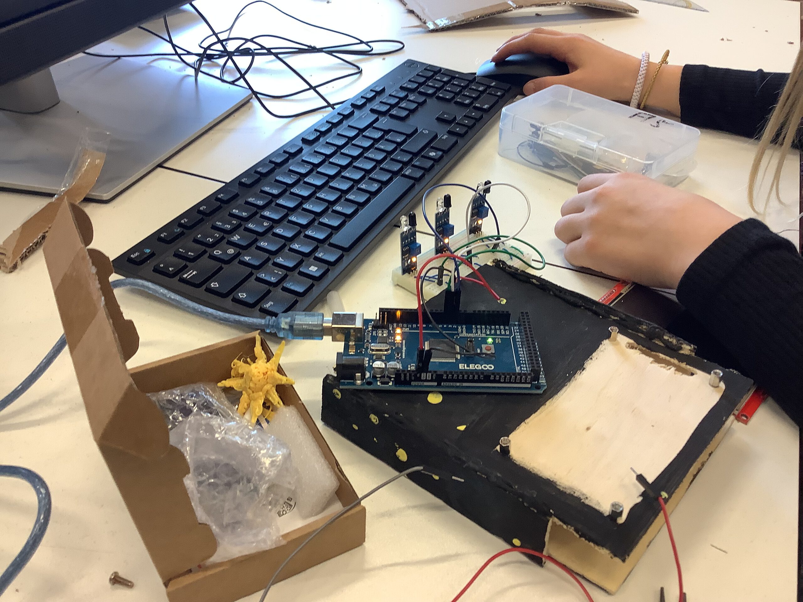 Auf den Bildern ist zu sehen, wie aktuell eine „Spacerennbahn“ entsteht. Auf dieser Bahn geht es darum, mit einem Kugelroboter die schnellste Zeit zu erreichen. Dabei verbinden sich Planung, Konstruktion und Erprobung zu einem spannenden Projekt, bei dem immer wieder getestet, verbessert und neu gedacht wird.