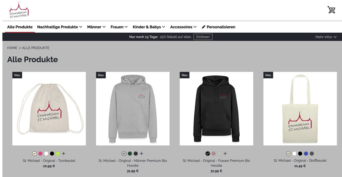 Du bist auf der Suche nach einem Hoodie mit Schul-Logo oder möchtest deinen Kakao oder Kaffee aus einer stilechten „St. Michael“-Tasse genießen?